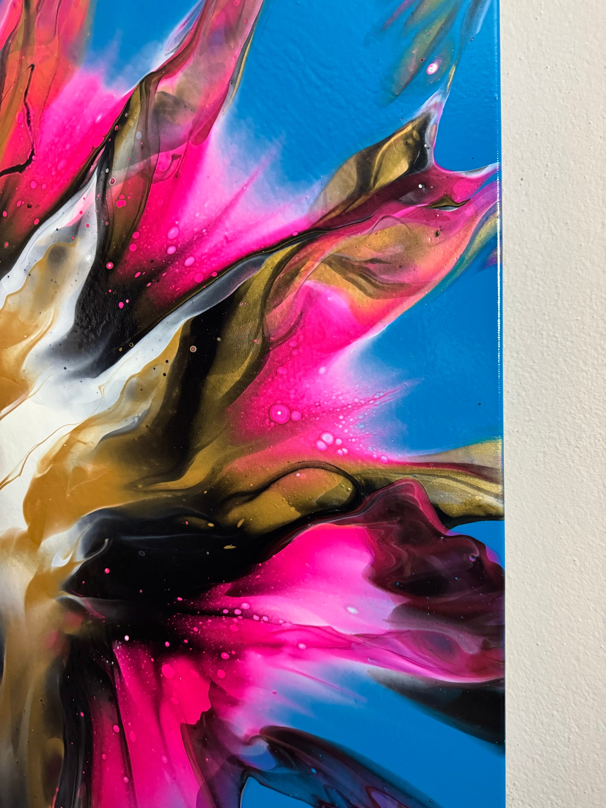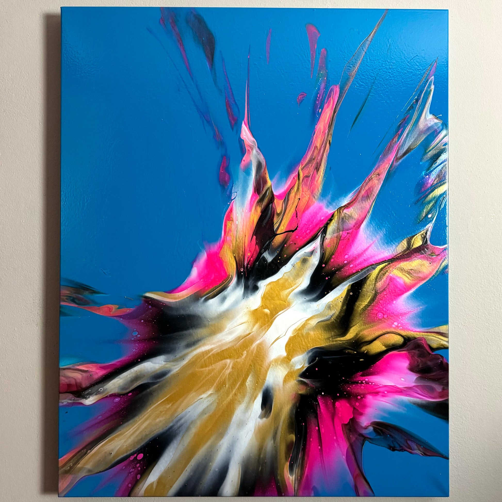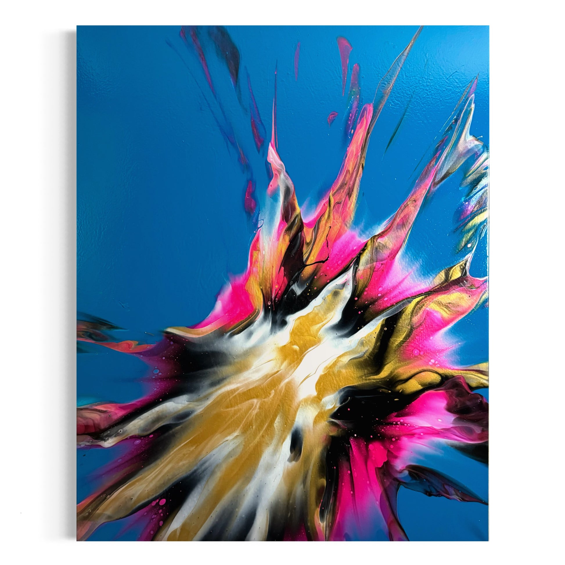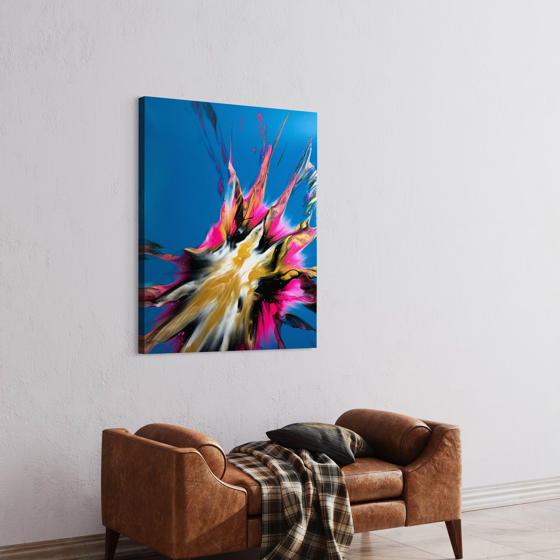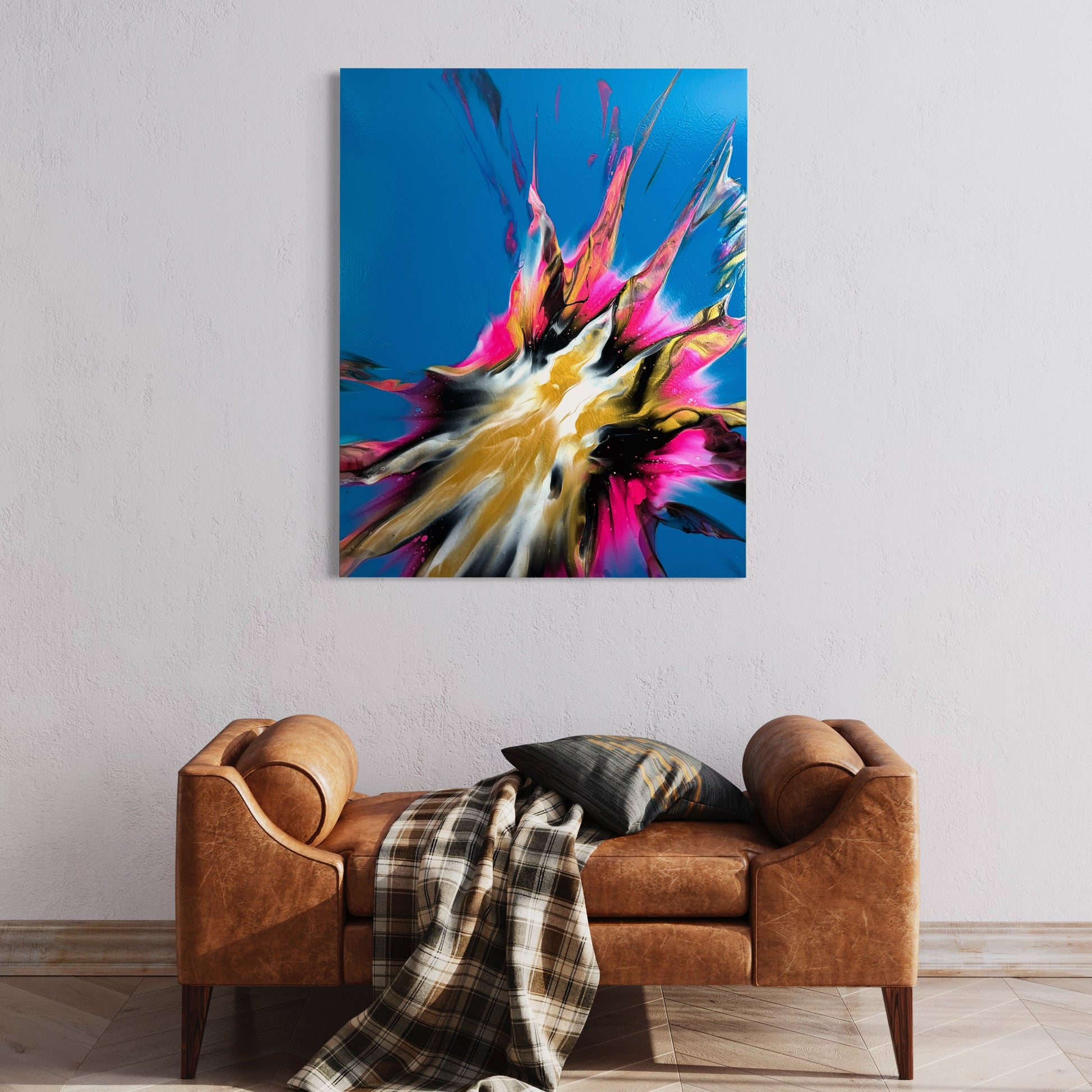 Experience stunning and bold design with my 100x80cm on canvas. The vibrant colors bring life to any room, while the blue base creates beautiful negative space. Add a touch of sophistication to your space with this versatile and eye-catching piece. It comes. With a gloss varnish finish