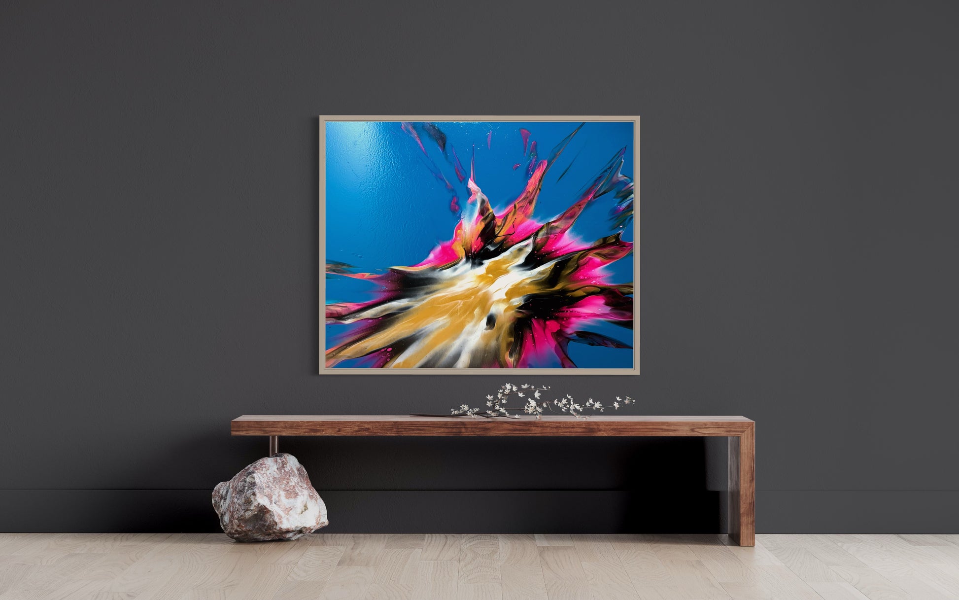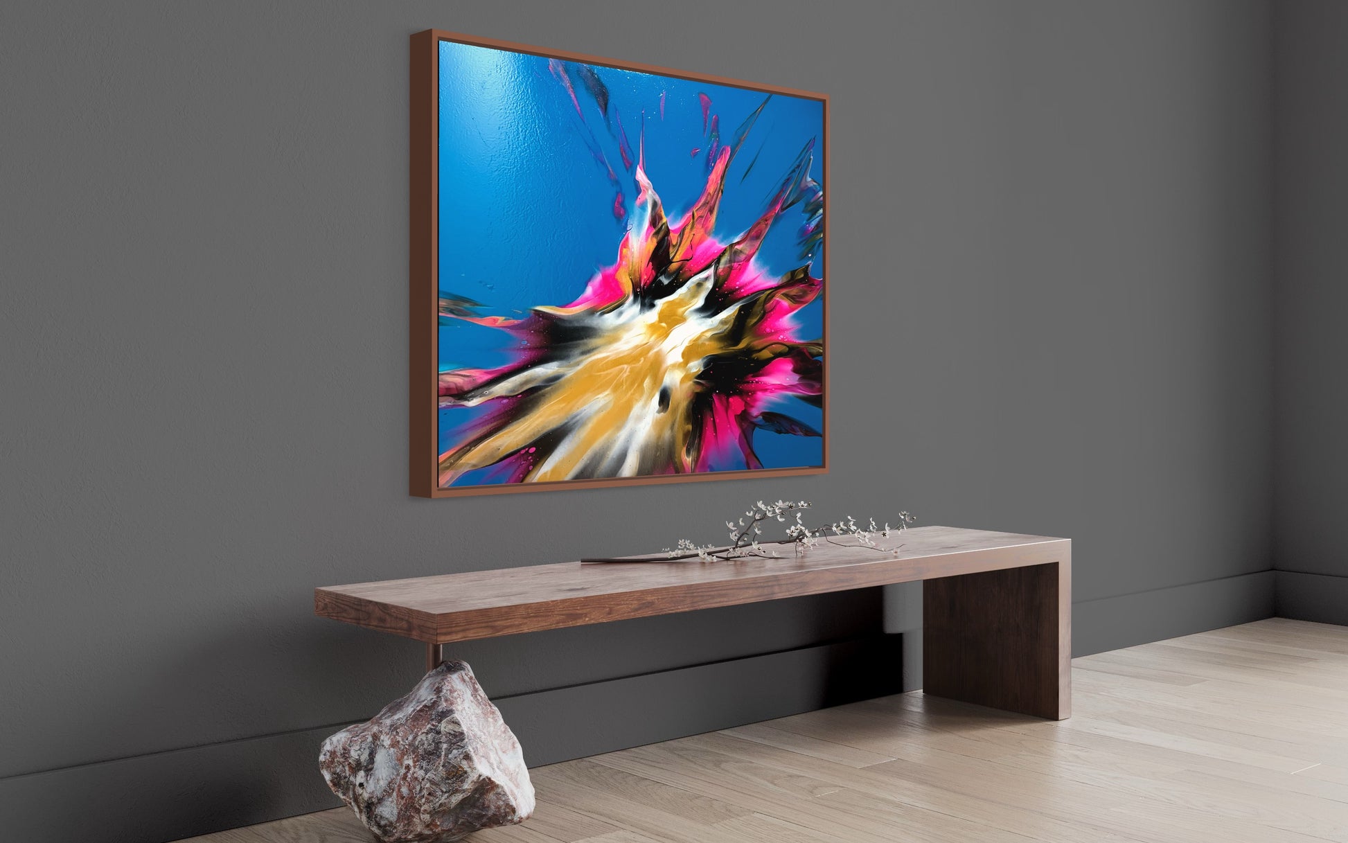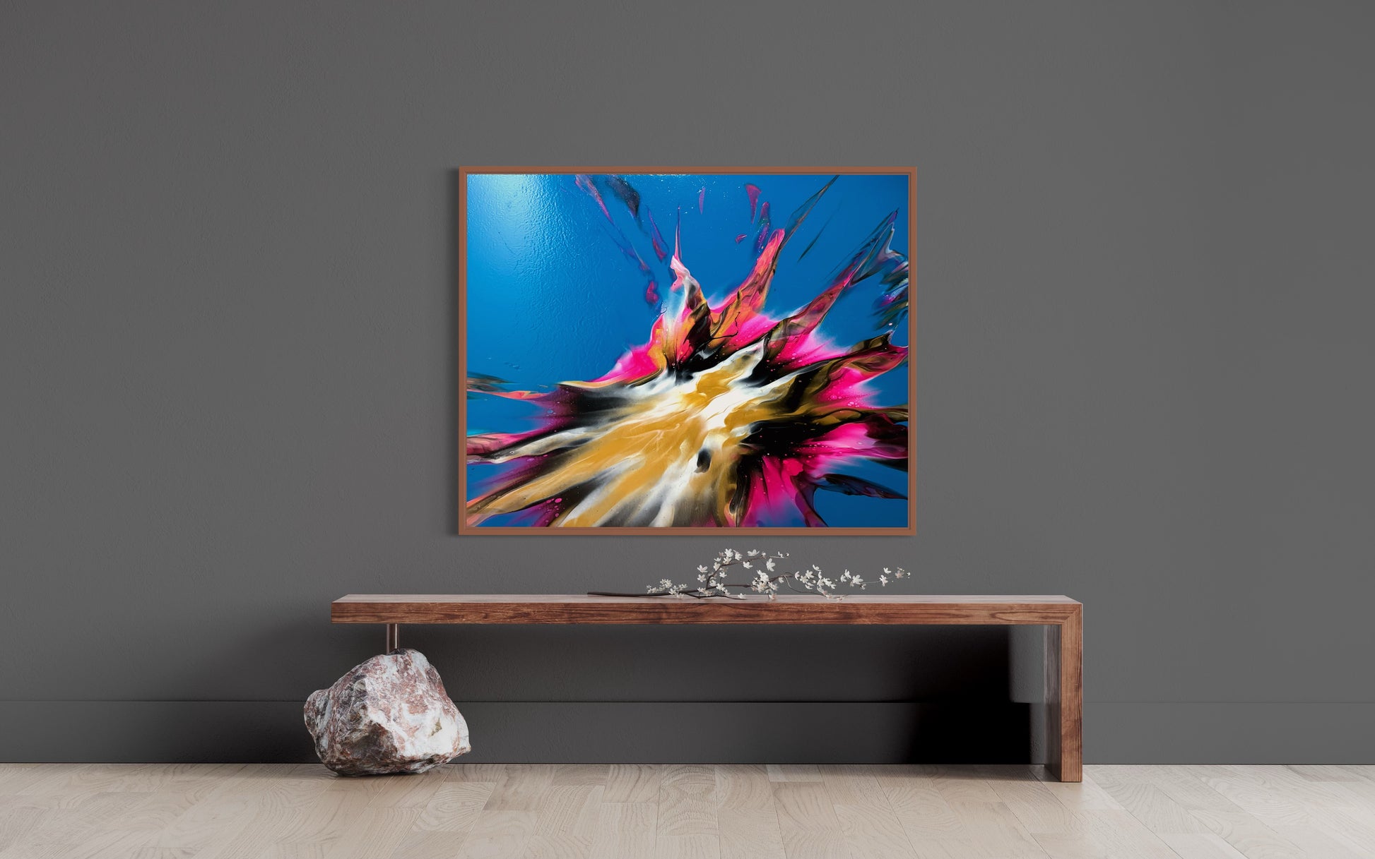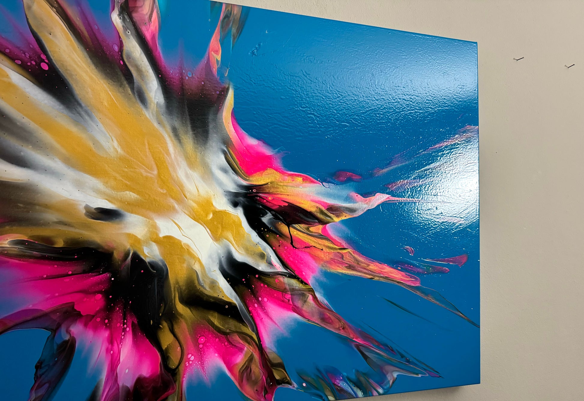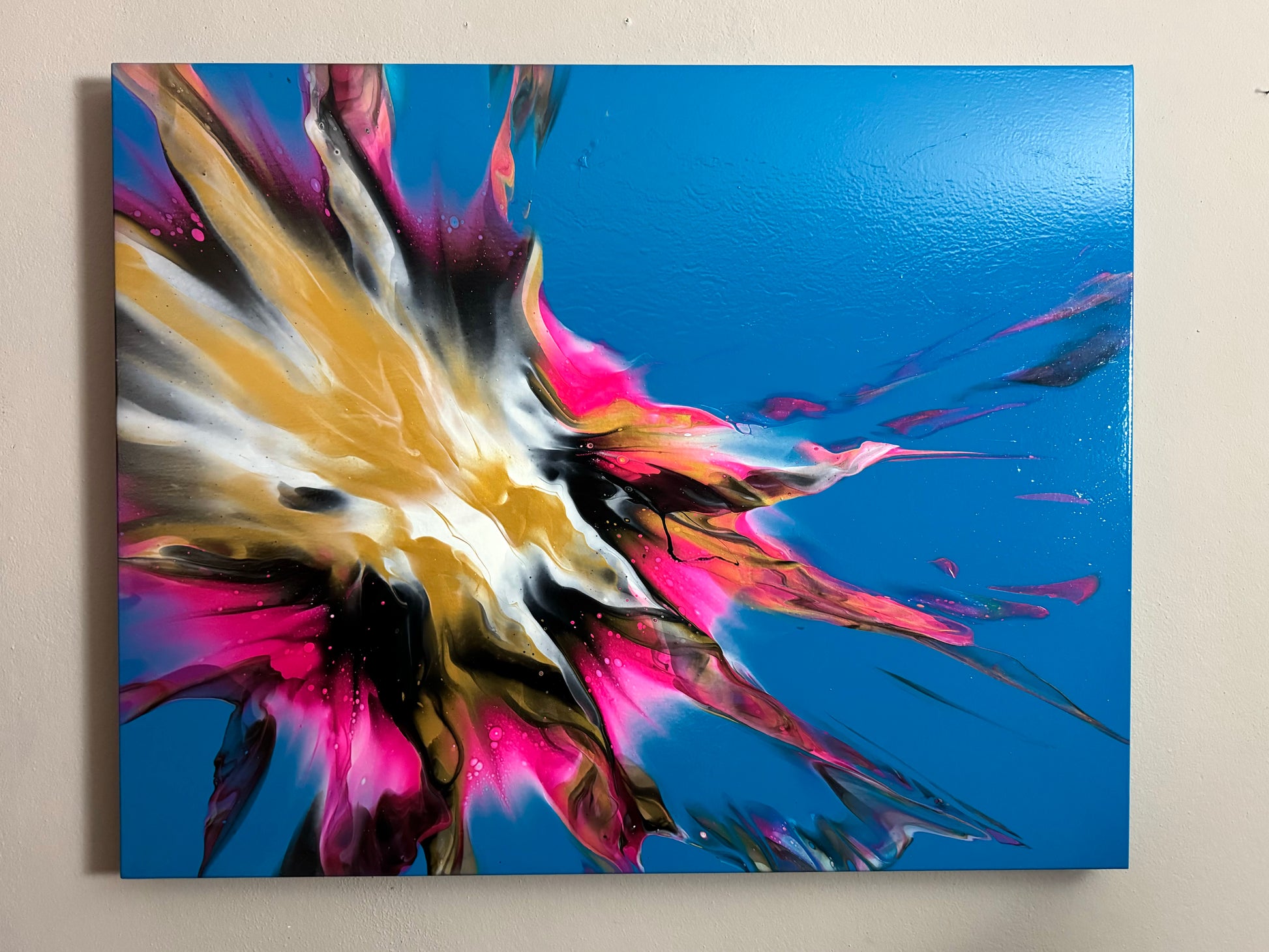 Experience stunning and bold design with my 100x80cm on canvas. The vibrant colors bring life to any room, while the blue base creates beautiful negative space. Add a touch of sophistication to your space with this versatile and eye-catching piece. It comes. With a gloss varnish finish