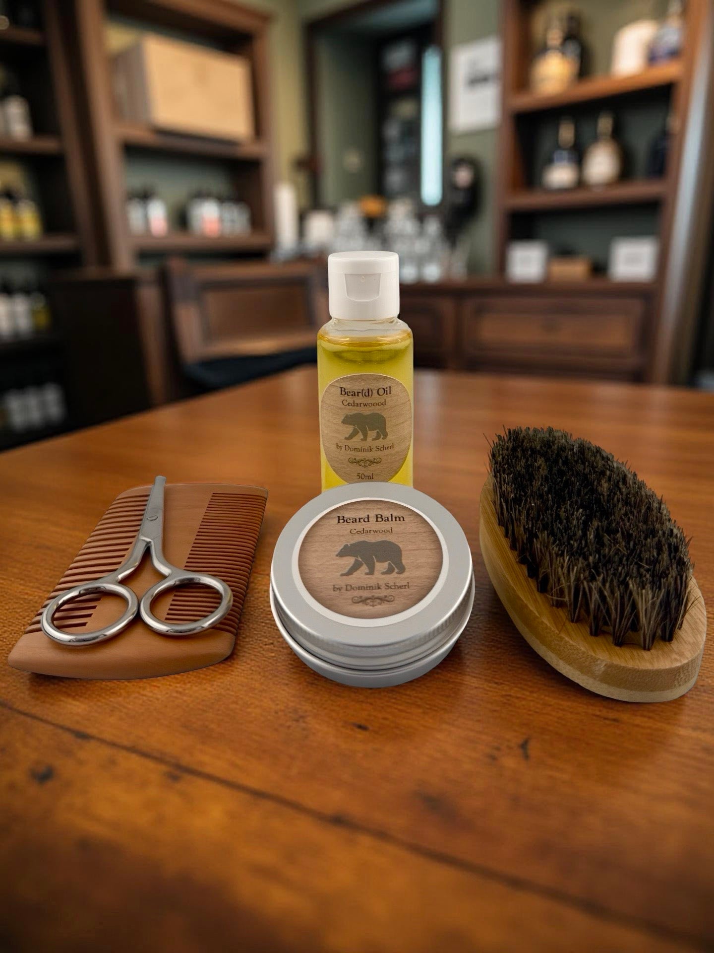 bestehend aus dem Bartöl (50ml), einem Bartbalm (30ml), einer Bartbürste und einer Schere um den Bart richtig zu pflegen und in Form zu halten!