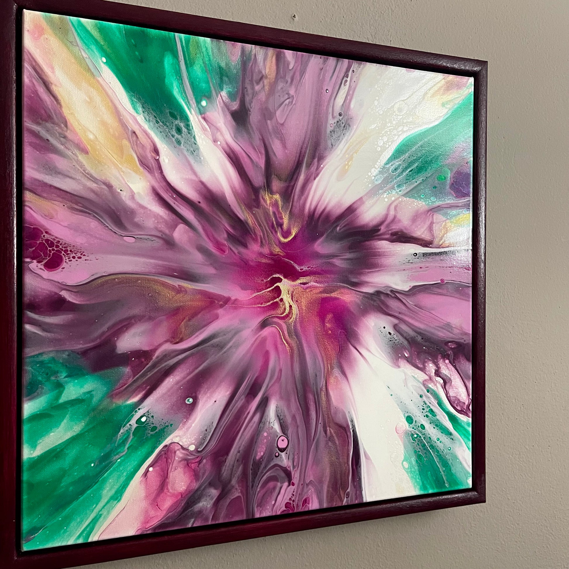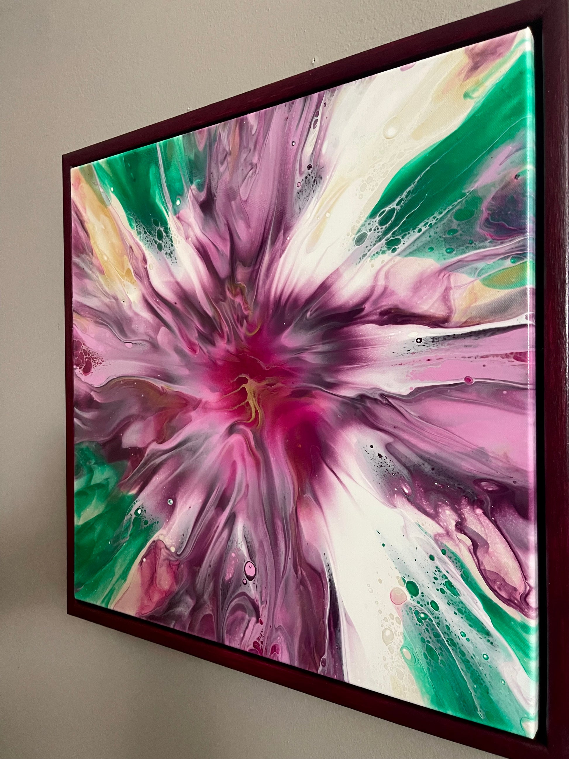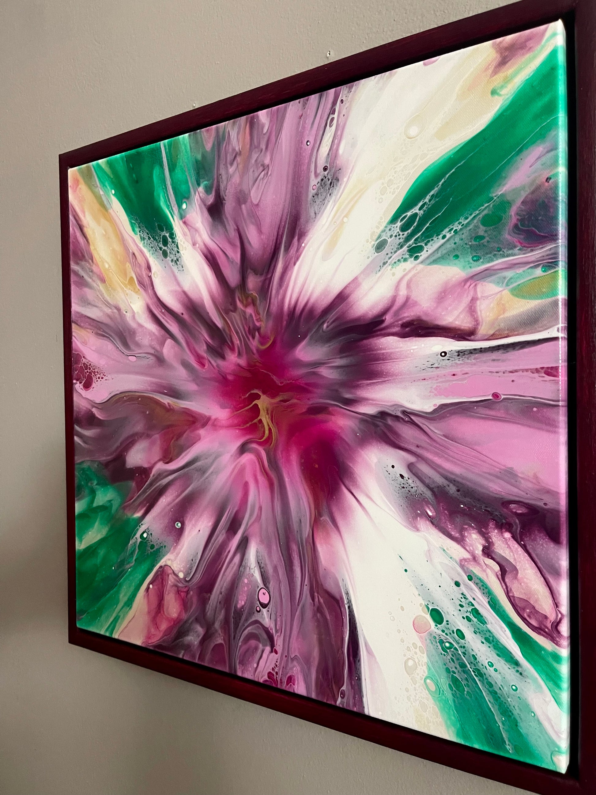 This acrylic painting on canvas features a vibrant magenta dominating the canvas and complemented by pops of green, gold, and pearl white against a crisp white background. Measuring 50x50cm (19,6x19,6inch), it is finished with a glossy coat for a truly mesmerizing effect. This one-of-a-kind piece exudes positivity and is sure to be the highlight of any space. It also includes a custom painted wooden frame for added elegance.