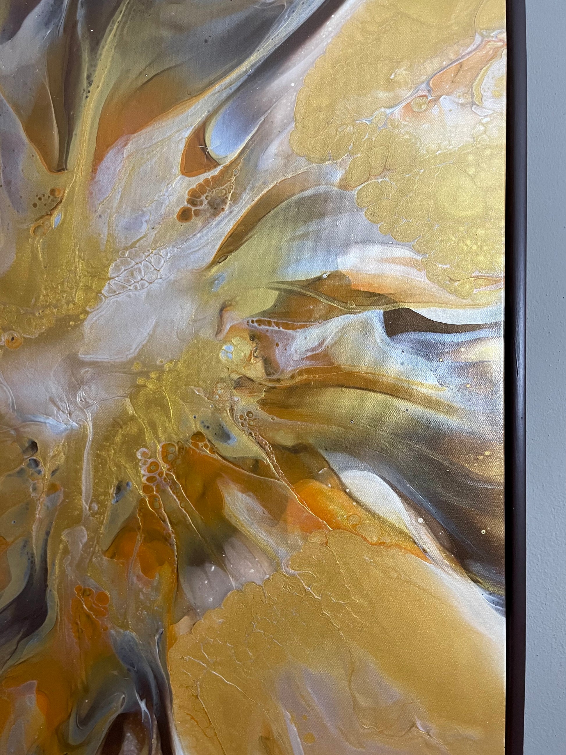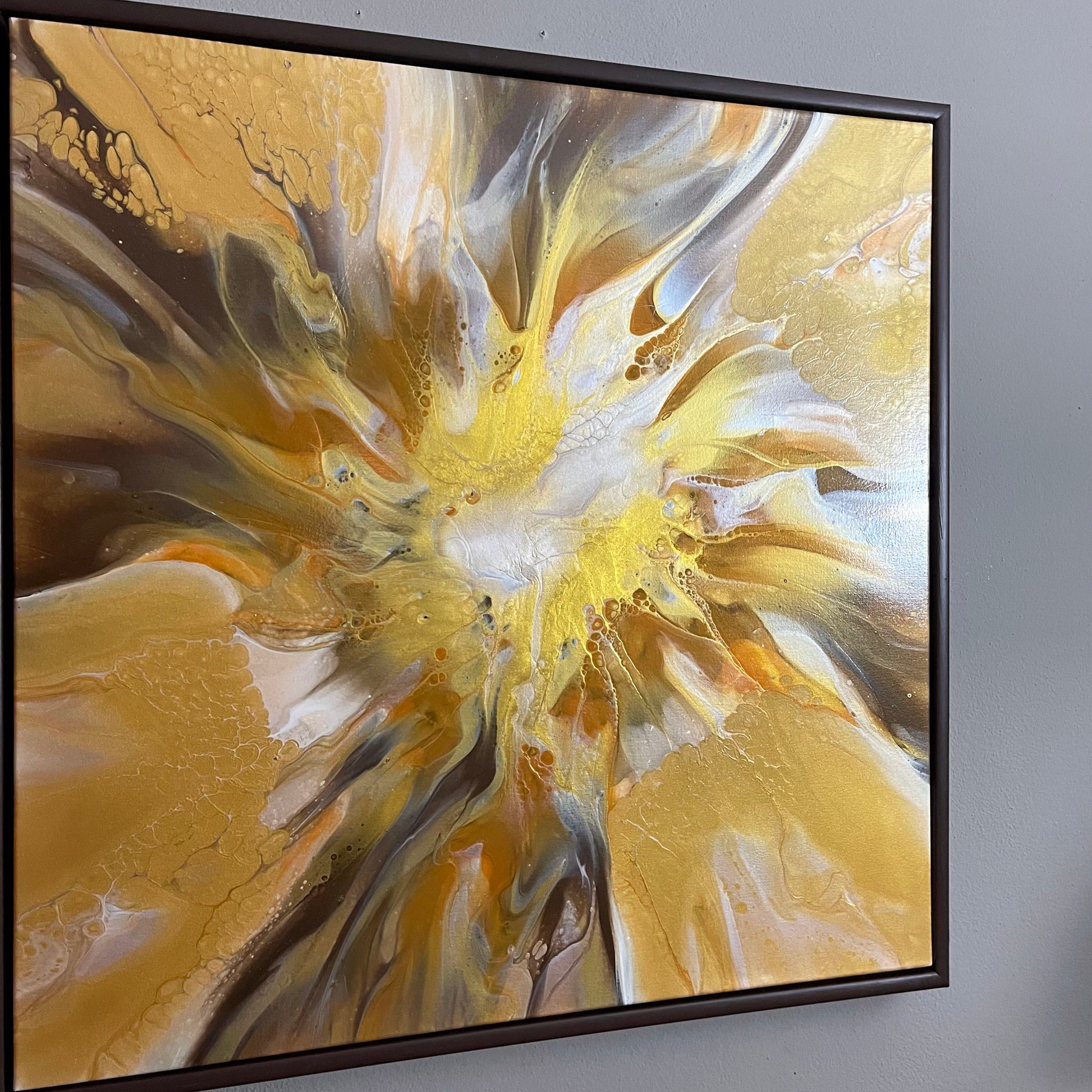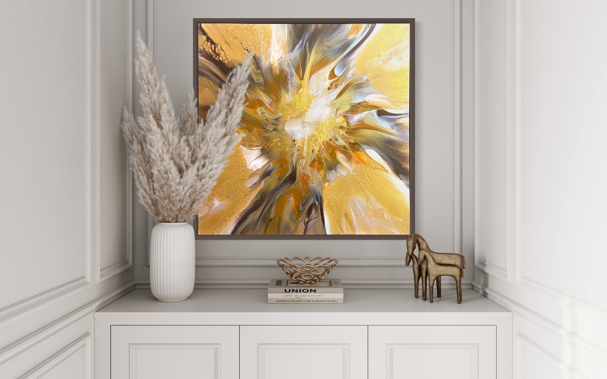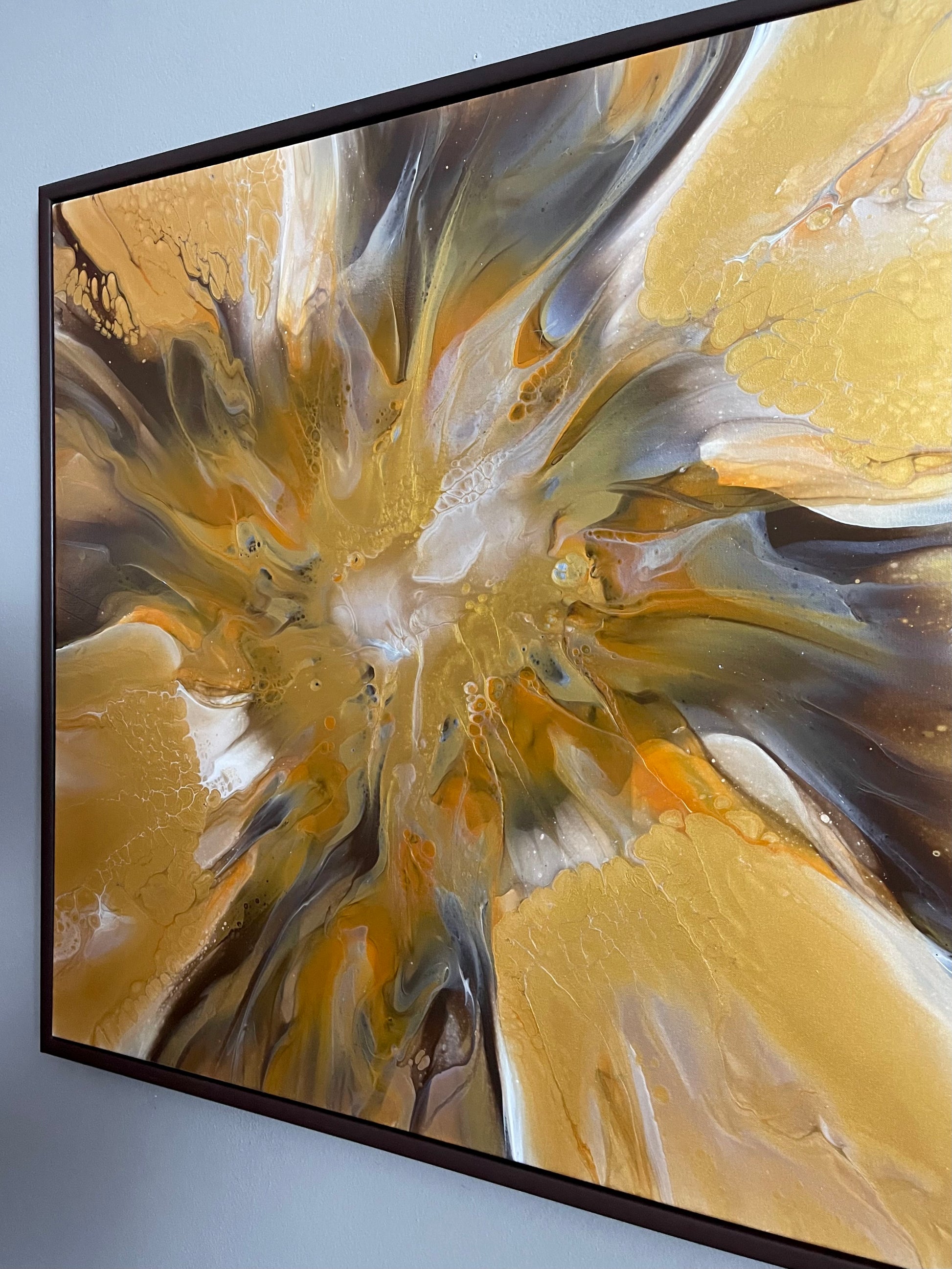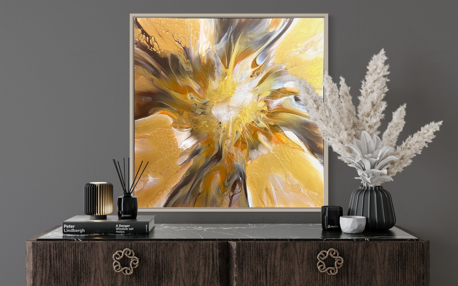 The luxurious "Gilded symphony" showcases a stunning 80x80cm acrylic fluid art painting featuring rich gold and neutral tones. This sophisticated piece exudes elegance and comes with a custom frame, available in either brown or white to perfectly complement your interior. Its glossy finish adds to its exclusivity and charm.