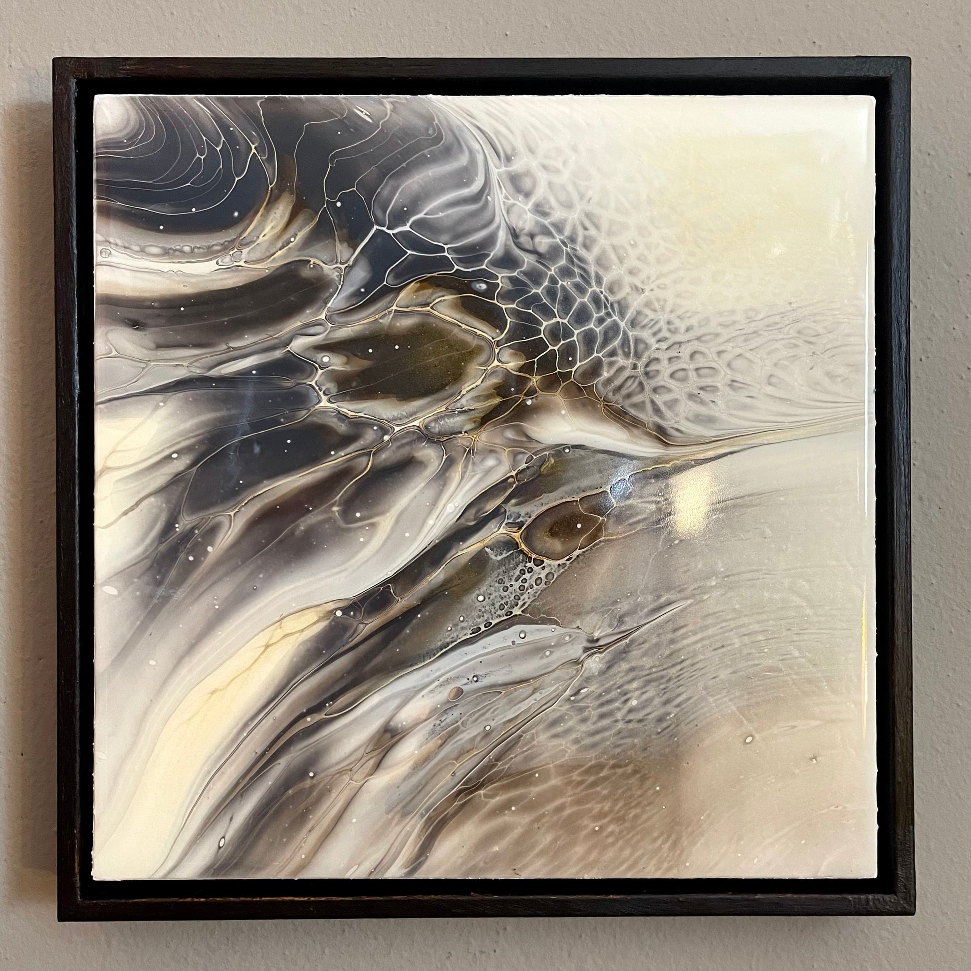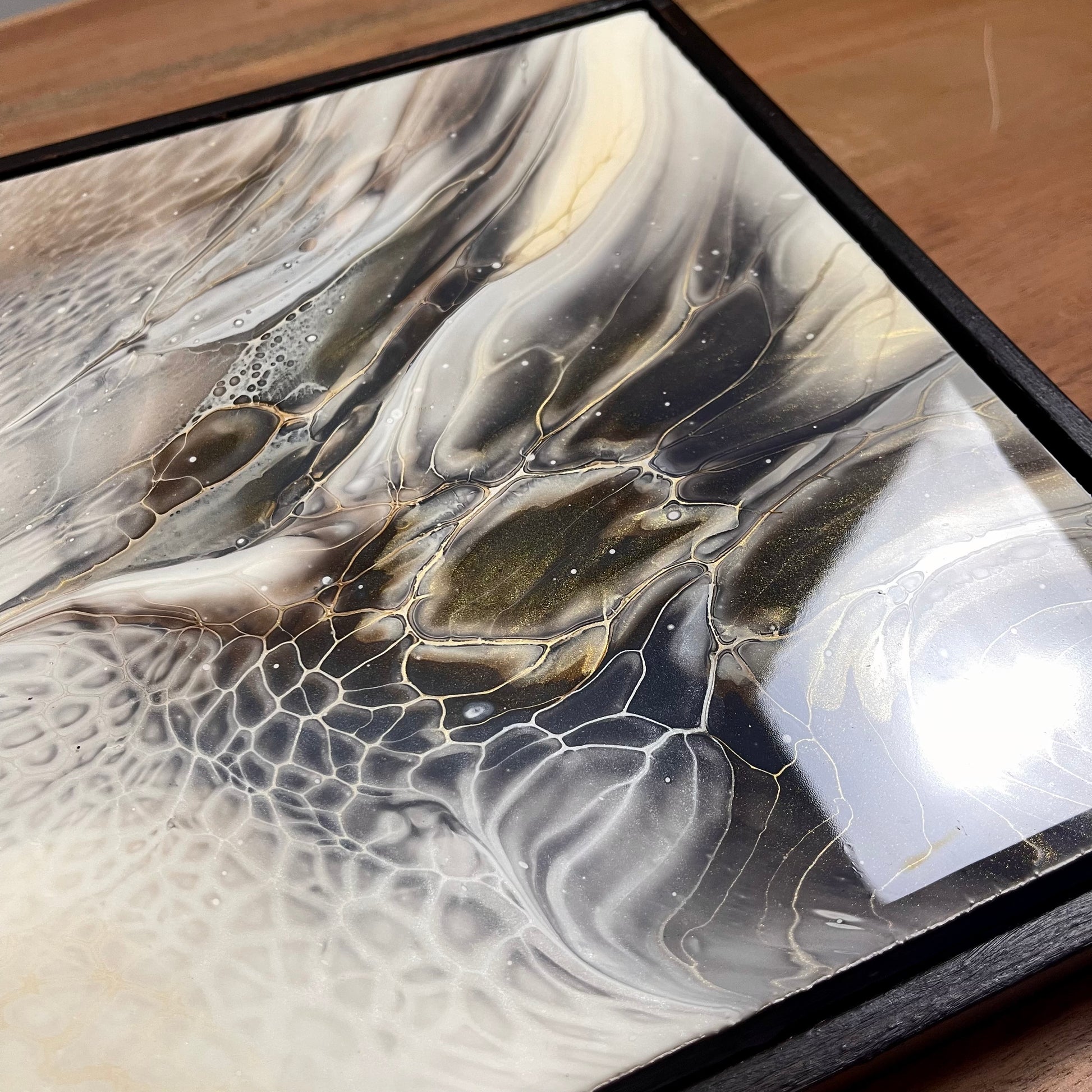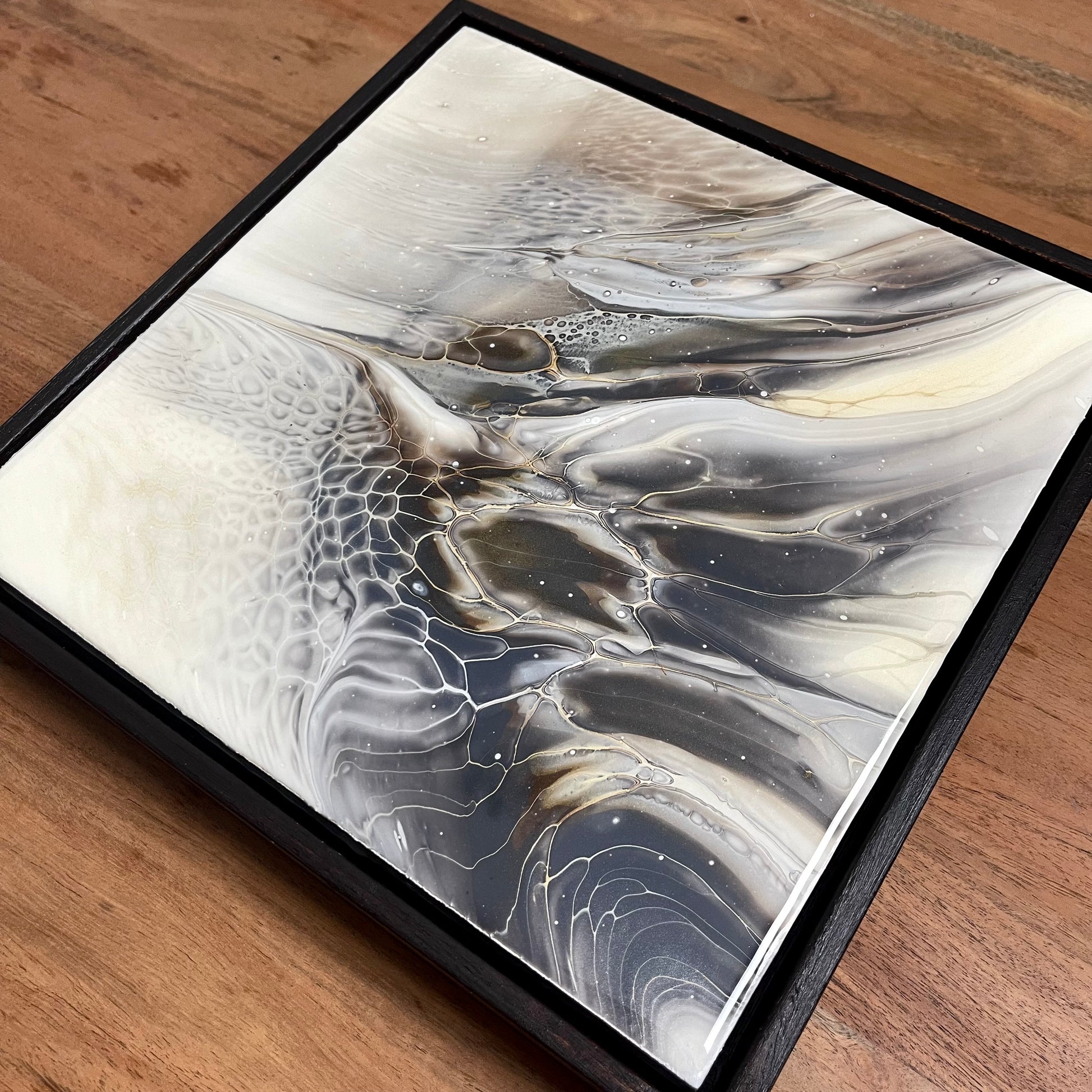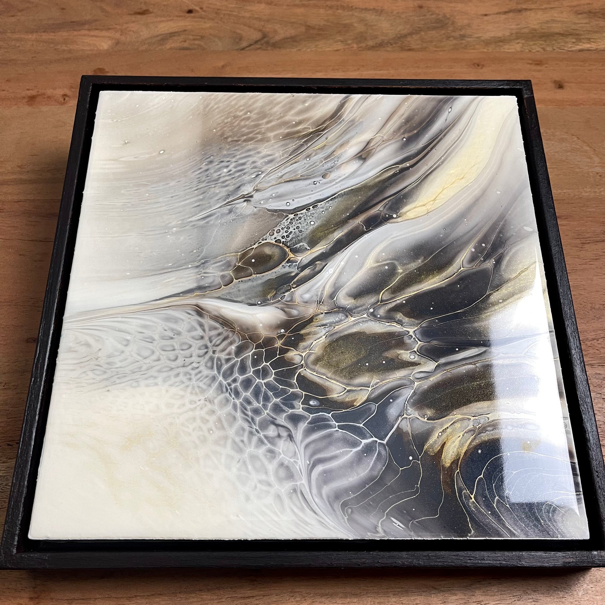 This exquisite artwork features a stunning fluid art painting, complete with a high-end, glossy resin finish and a beautifully crafted dark brown frame. Measuring at 25x25cm, it's the perfect addition to any space and is sure to captivate and inspire you. Experience the beauty and wonder of a hummingbird through this carefully crafted piece.