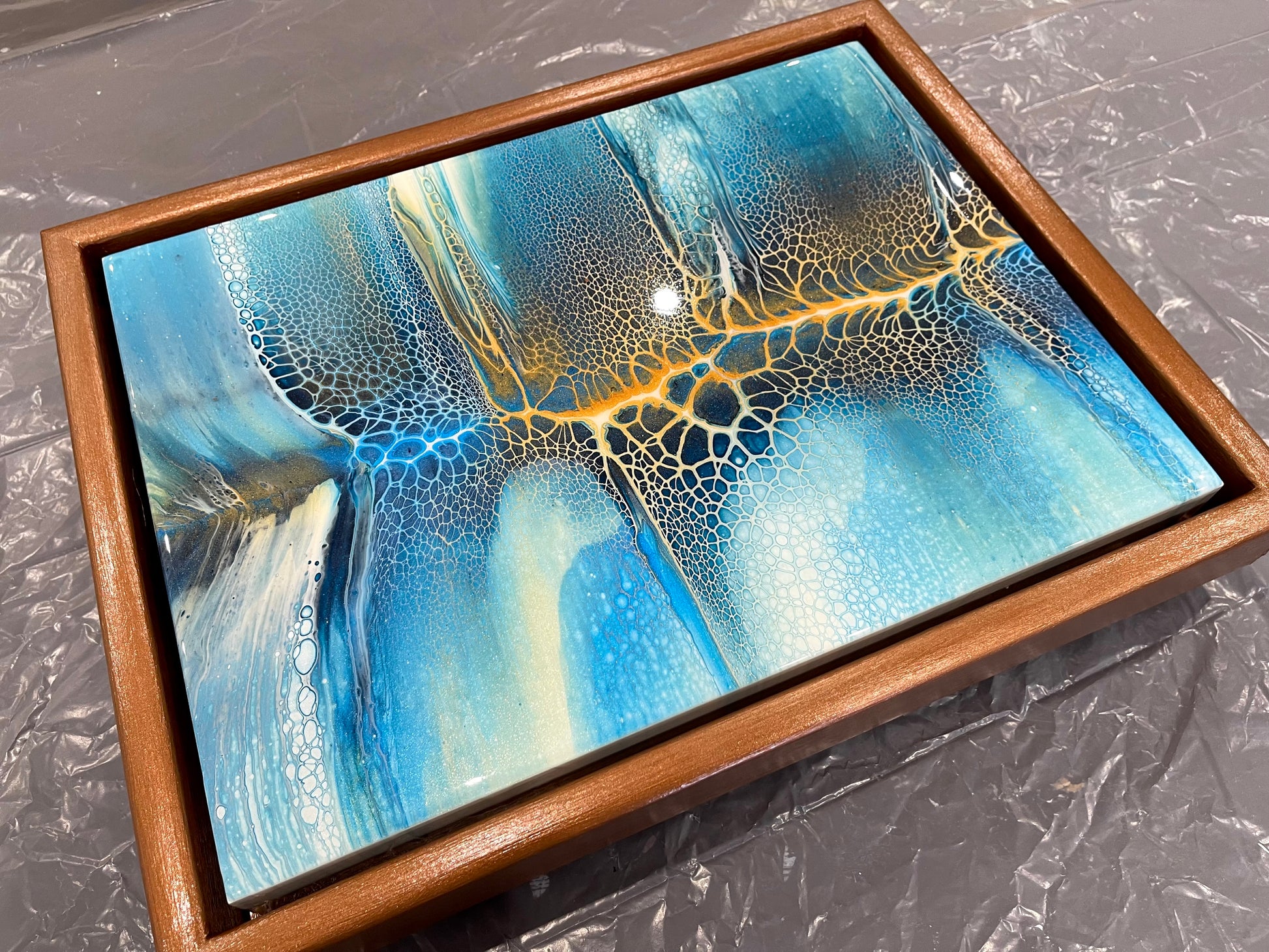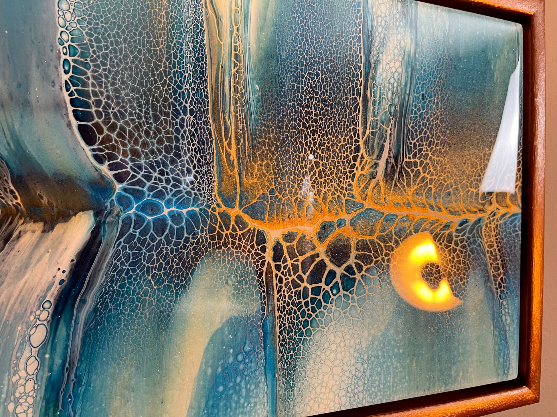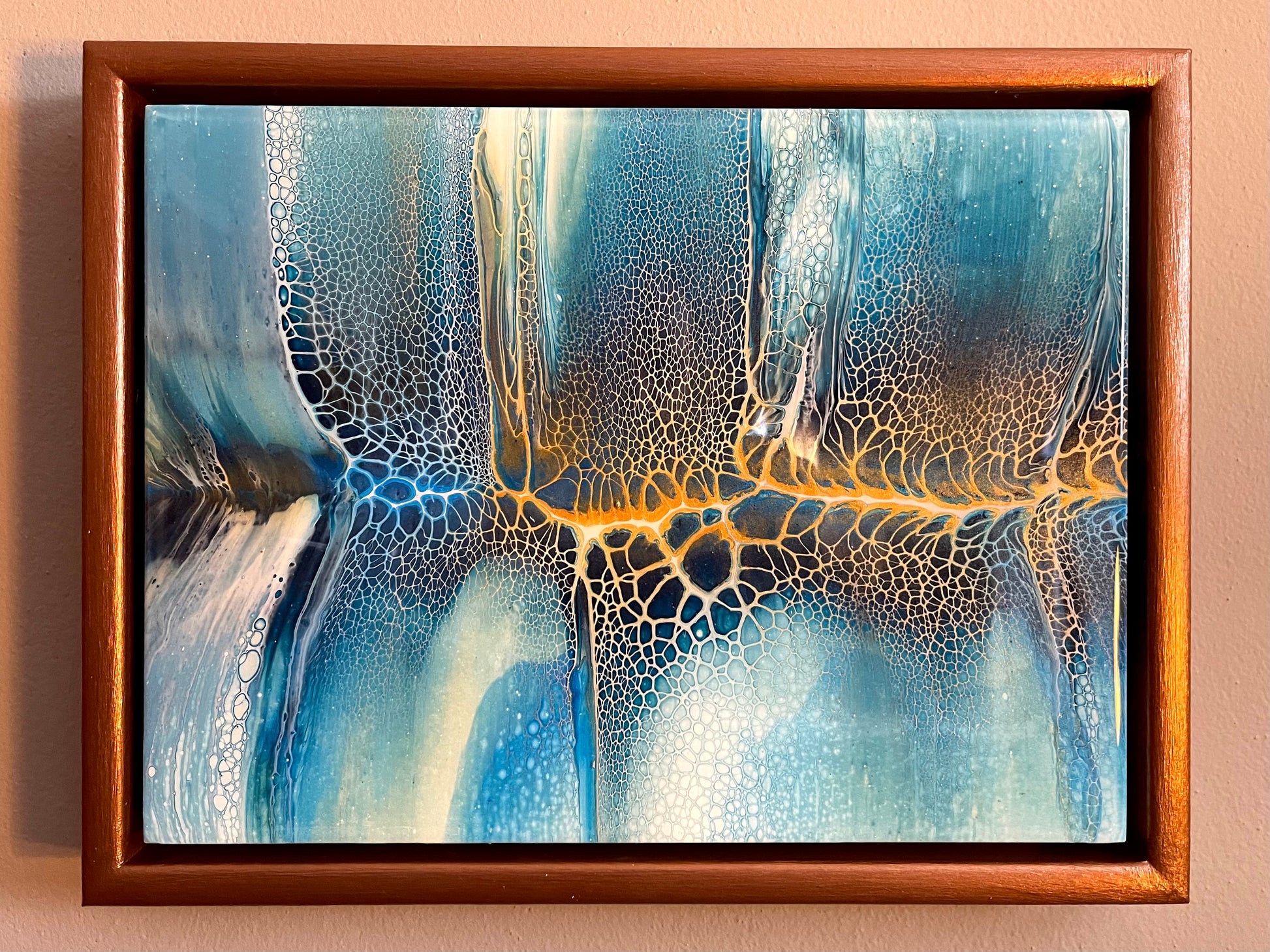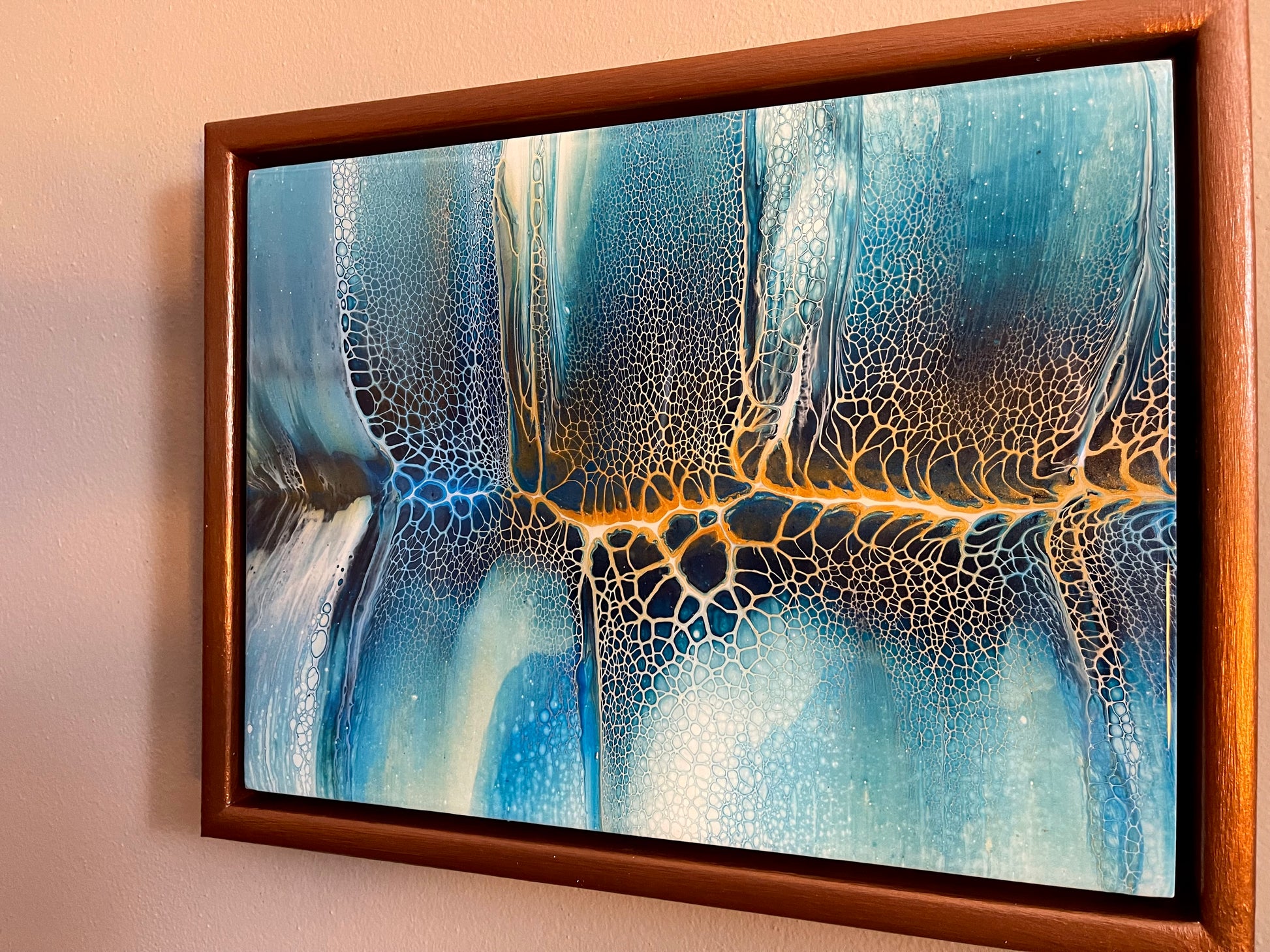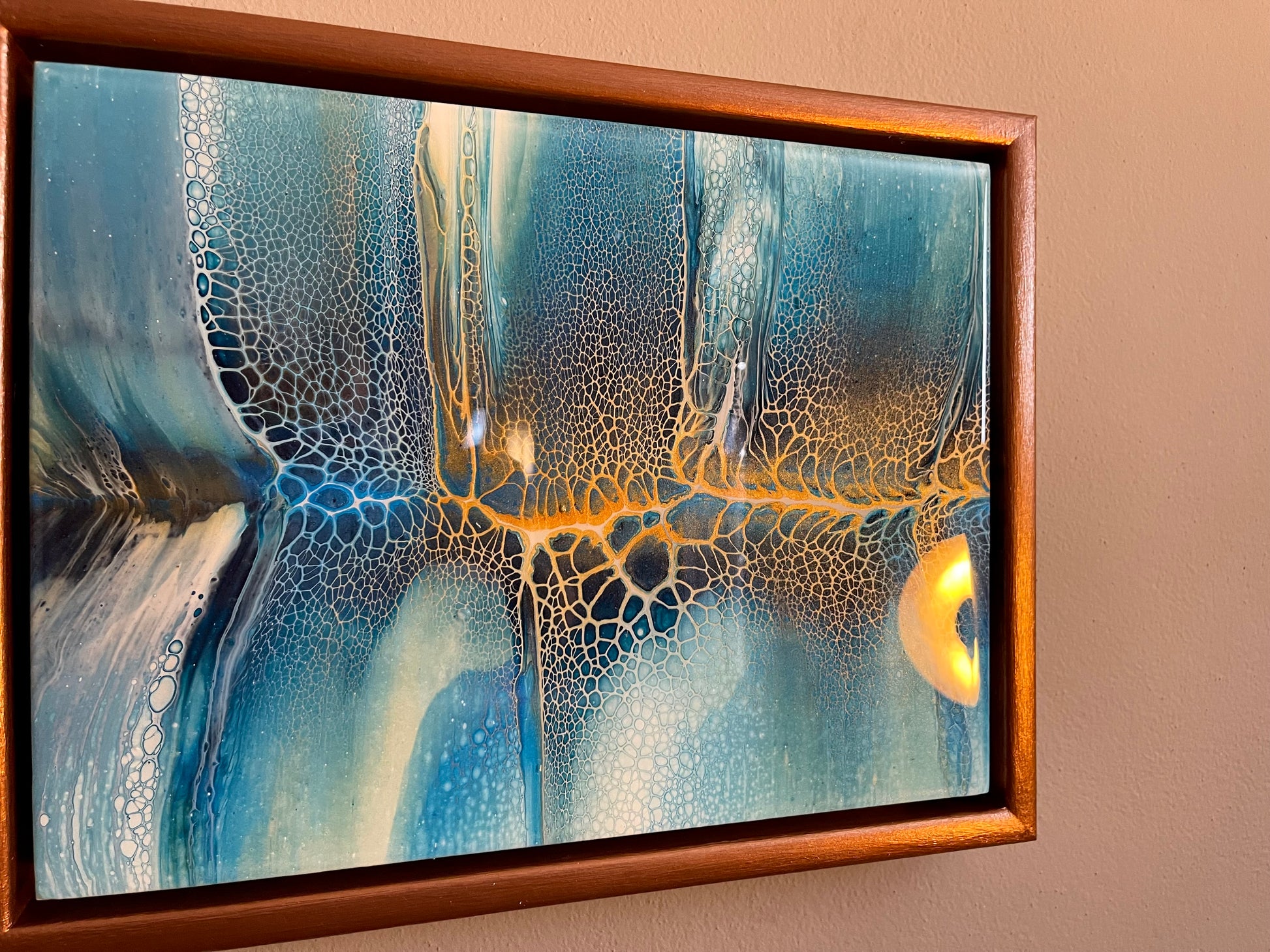 This fluid art acrylic painting on canvas features a stunning combination of orange and bronze on a gorgeous blue background. The composition is horizontal, adding to its overall appeal. Complete with a glossy resin finish, this 40x30cm (15.8x11.8inch) piece truly embodies luxury and sophistication.