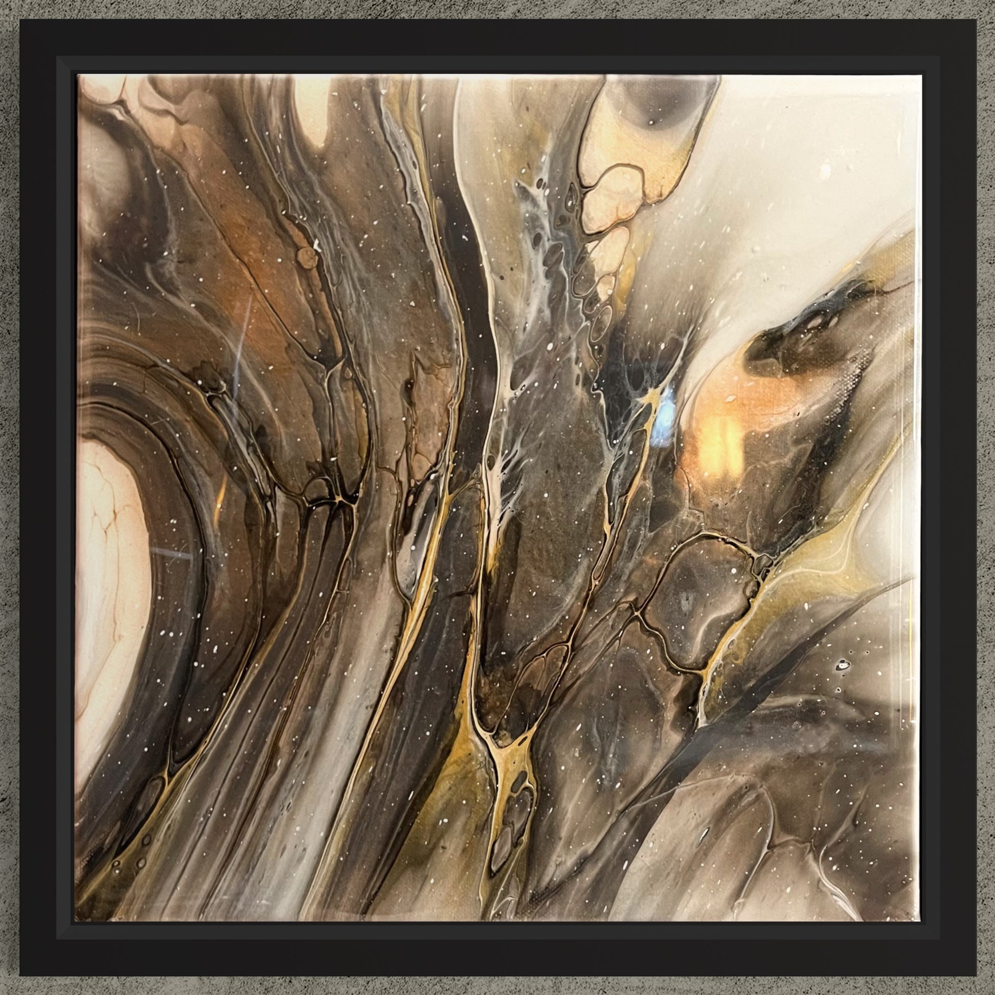 Explore the earthy, organic textures and colors in this 30x30cm acrylic fluid art painting. The finish is like smooth glass resin, adding a touch of natural vibes.