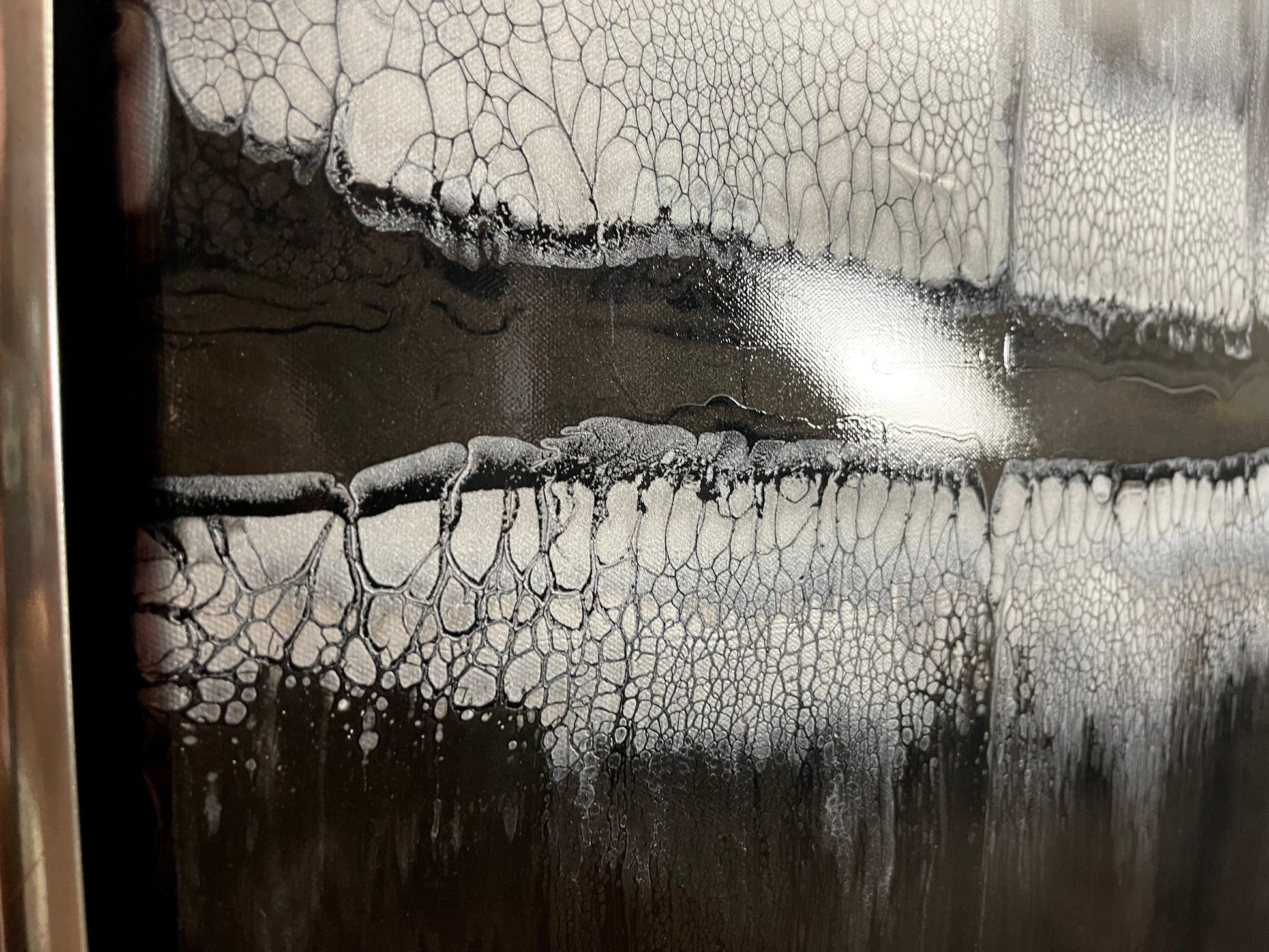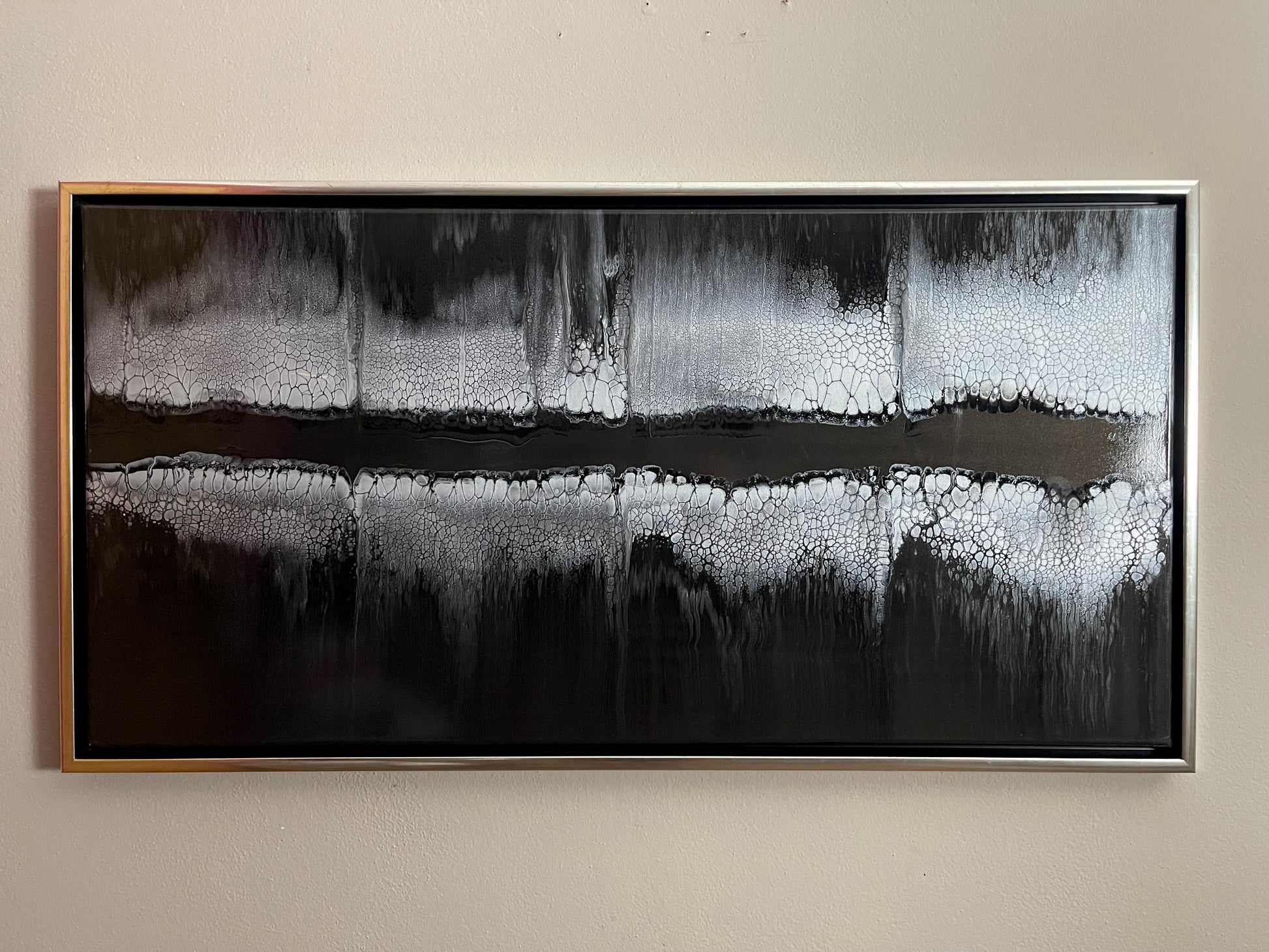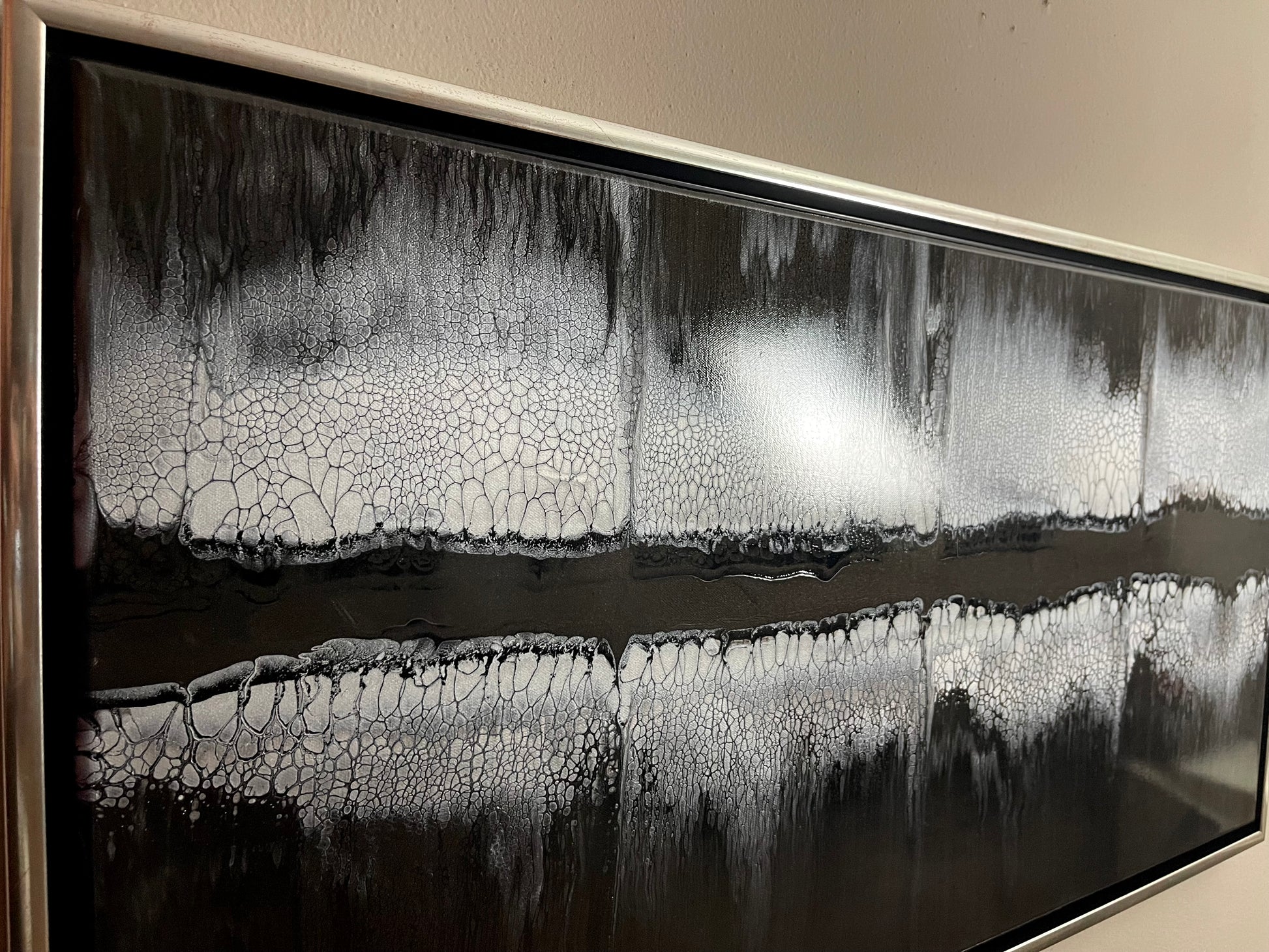 Experience the captivating allure of "Moonlit Obsidian", a monochromatic acrylic painting on a 100x50cm canvas. This stunning piece boasts intricate details and organic textures, shimmering with silver and pearl white hues against a rich black background. Finished with a glossy coat and framed in a sleek wooden silver shadow frame, this piece will add a touch of effortless elegance to any space.