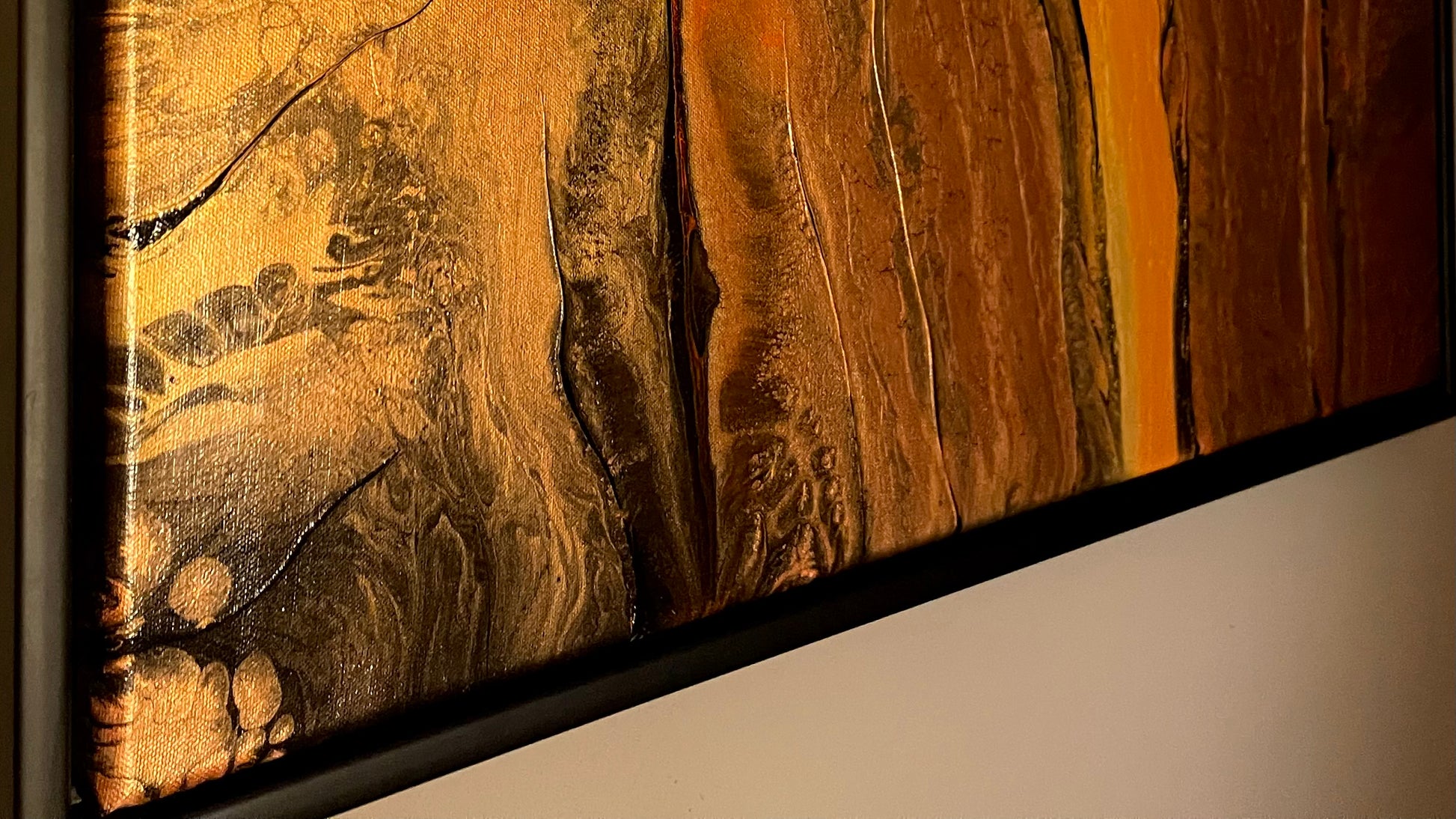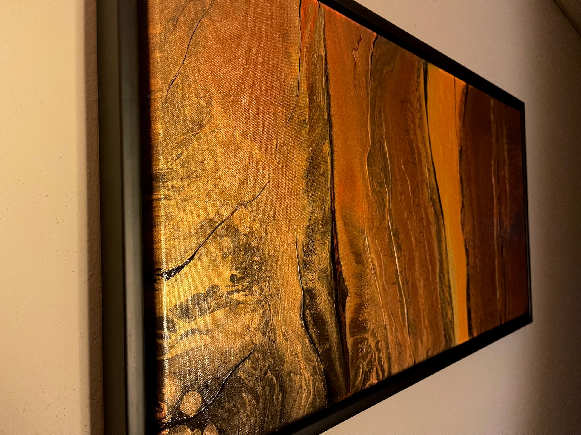 Experience the mesmerizing beauty of "Mount Doom" with this fluid art acrylic painting on canvas. Measuring 40x80cm and finished with a sleek glossy coat, this stunning piece is further enhanced by a stylish black wooden shadow frame. The metallics, neutrals, and black colors blend together in a captivating landscape-like composition, with intricate details and organic textures that will transport you into the artwork. Inspired by vibrant volcano colors, the glossy finish adds a depth and intensity to the colors.