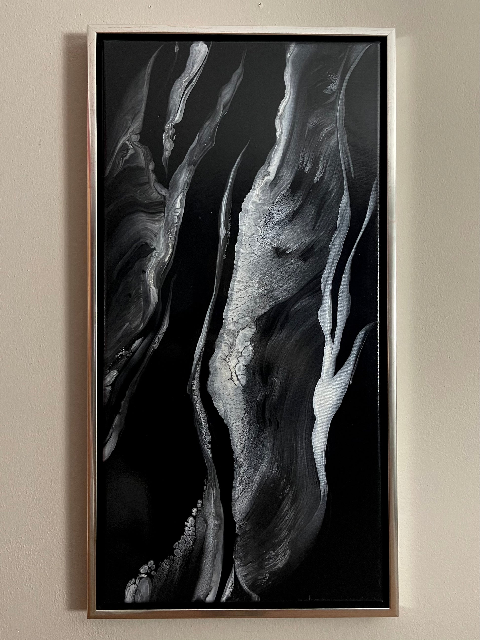 Fluid art acrylic painting on canvas. Finished with a glossy finish on 40x80cm (15,7x31,5inch) Installed is a nice wooden silver shadow frame