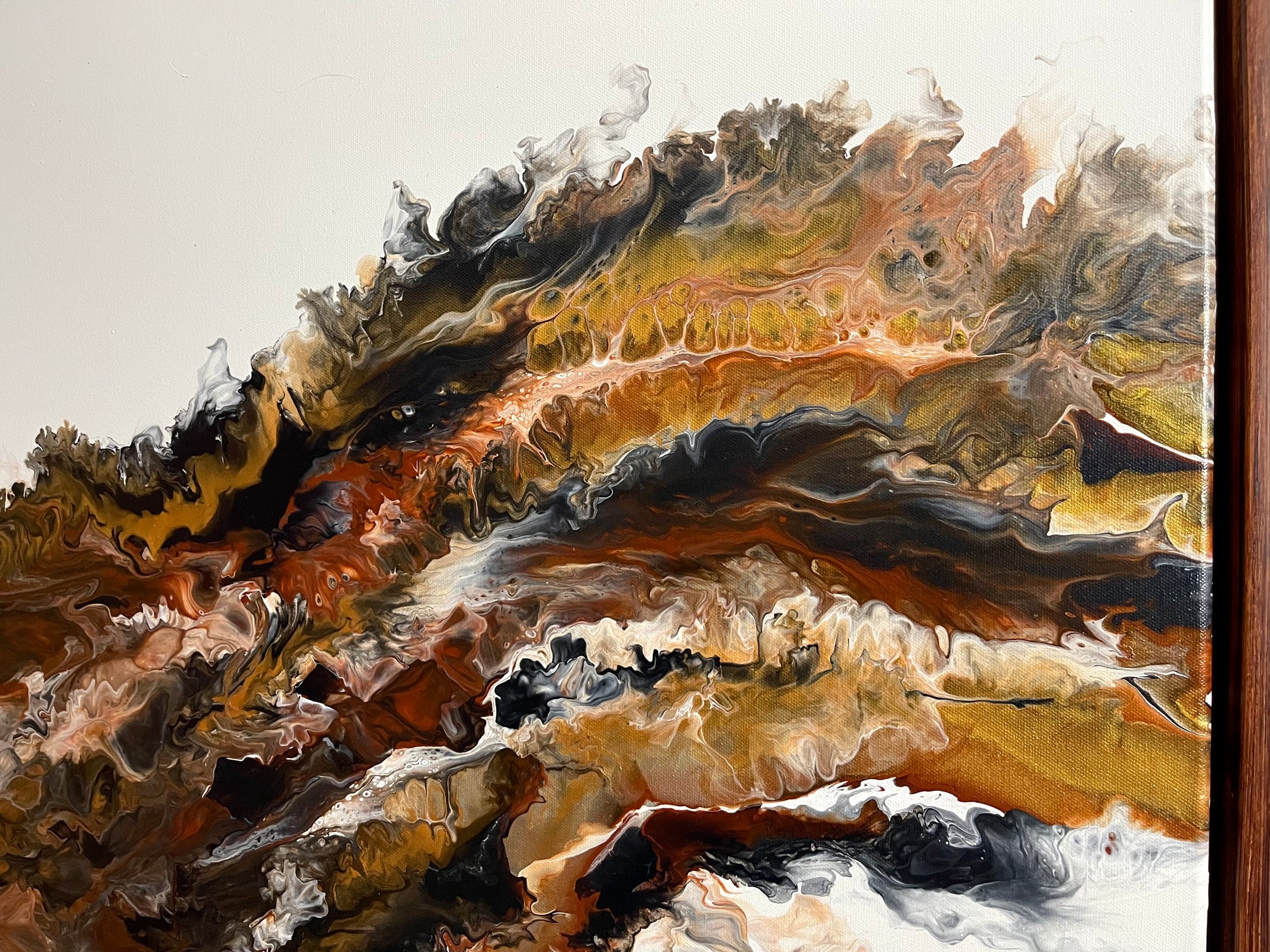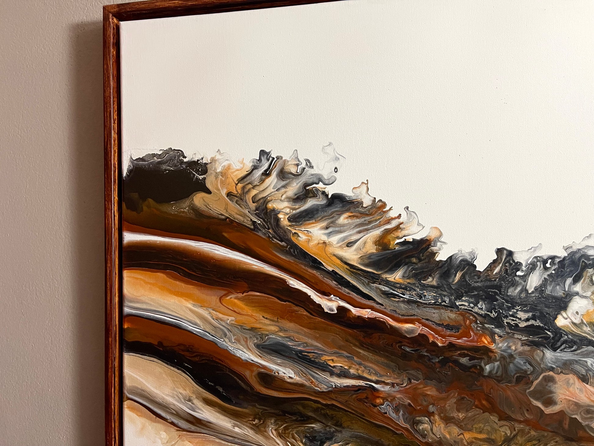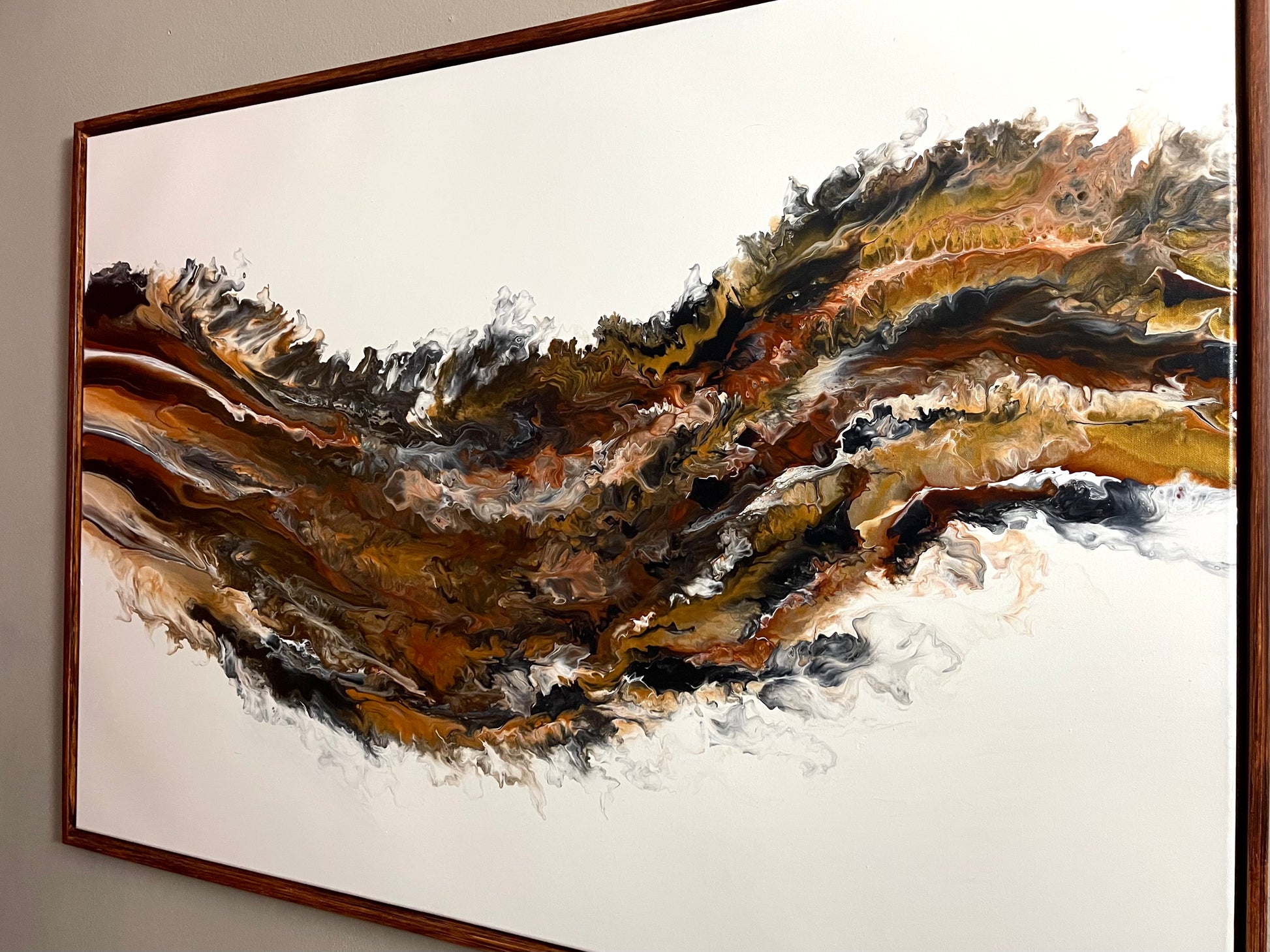 Experience a luminous wave with this remarkable 130x90cm acrylic artwork. The combination of metallic and neutral tones on a white canvas creates a mesmerizing wave-like pattern. Adorned with a hand-painted wooden frame, this masterpiece brings an elevated touch of luminance to any environment.