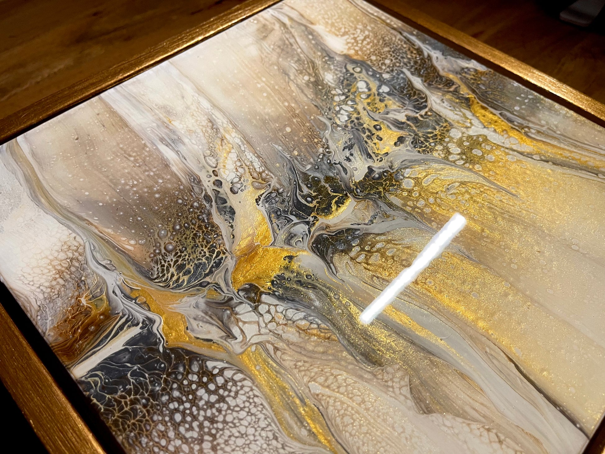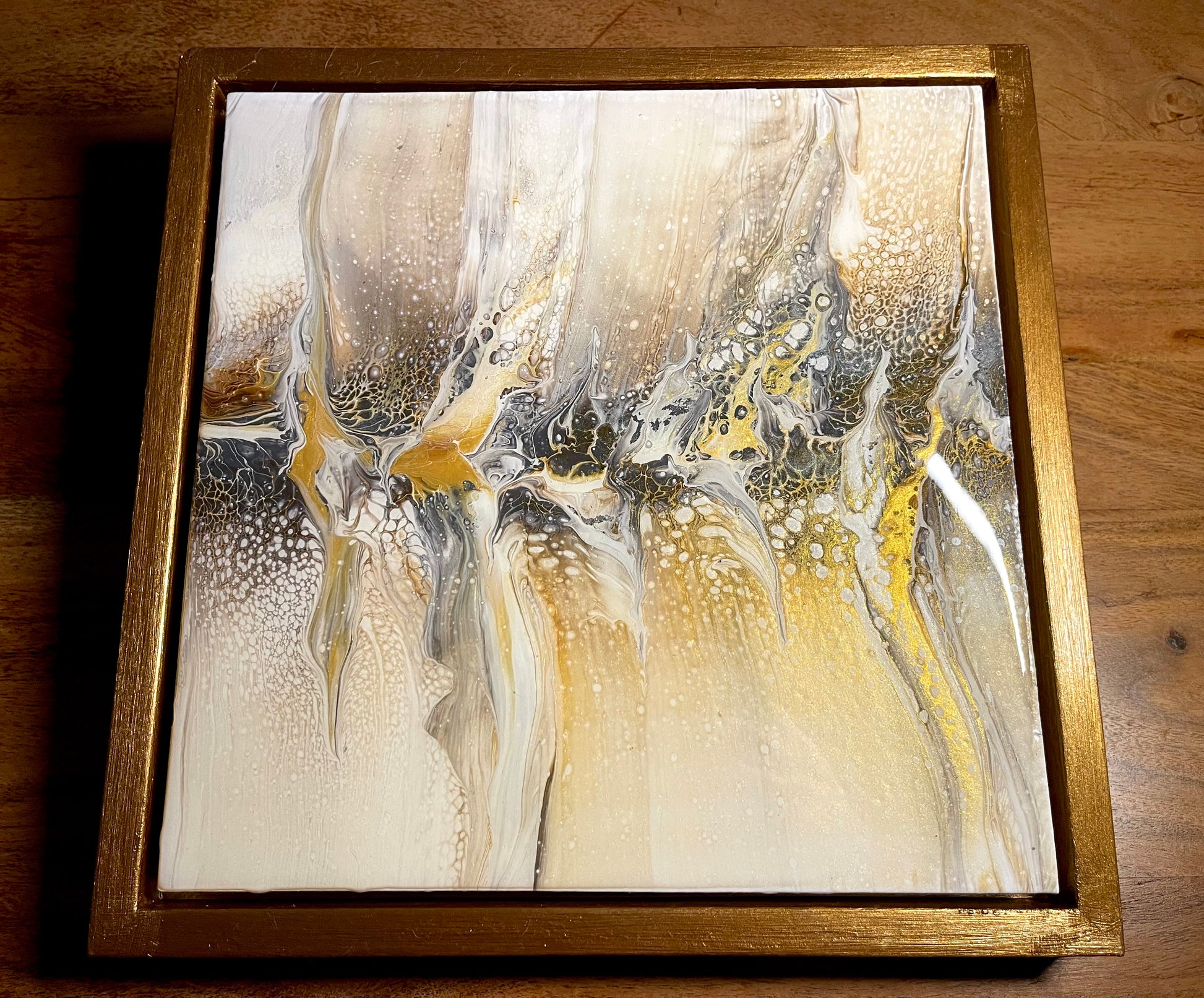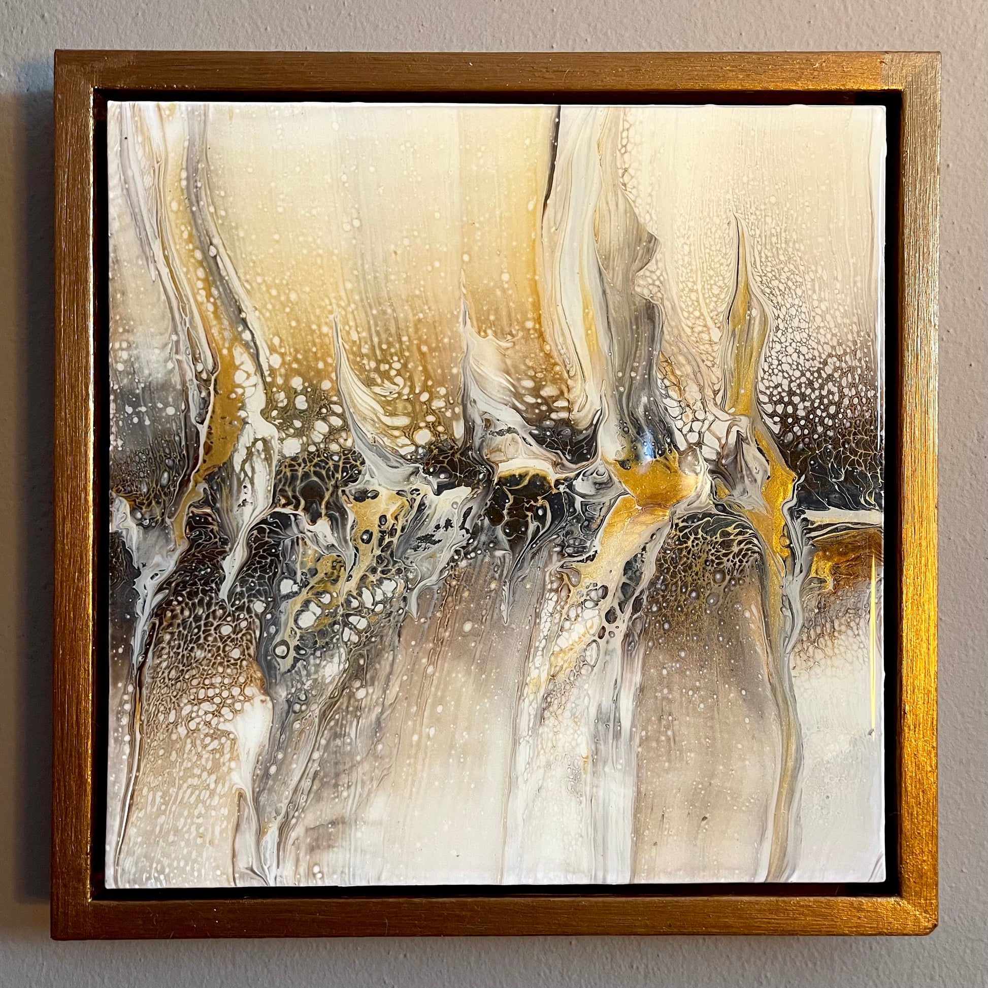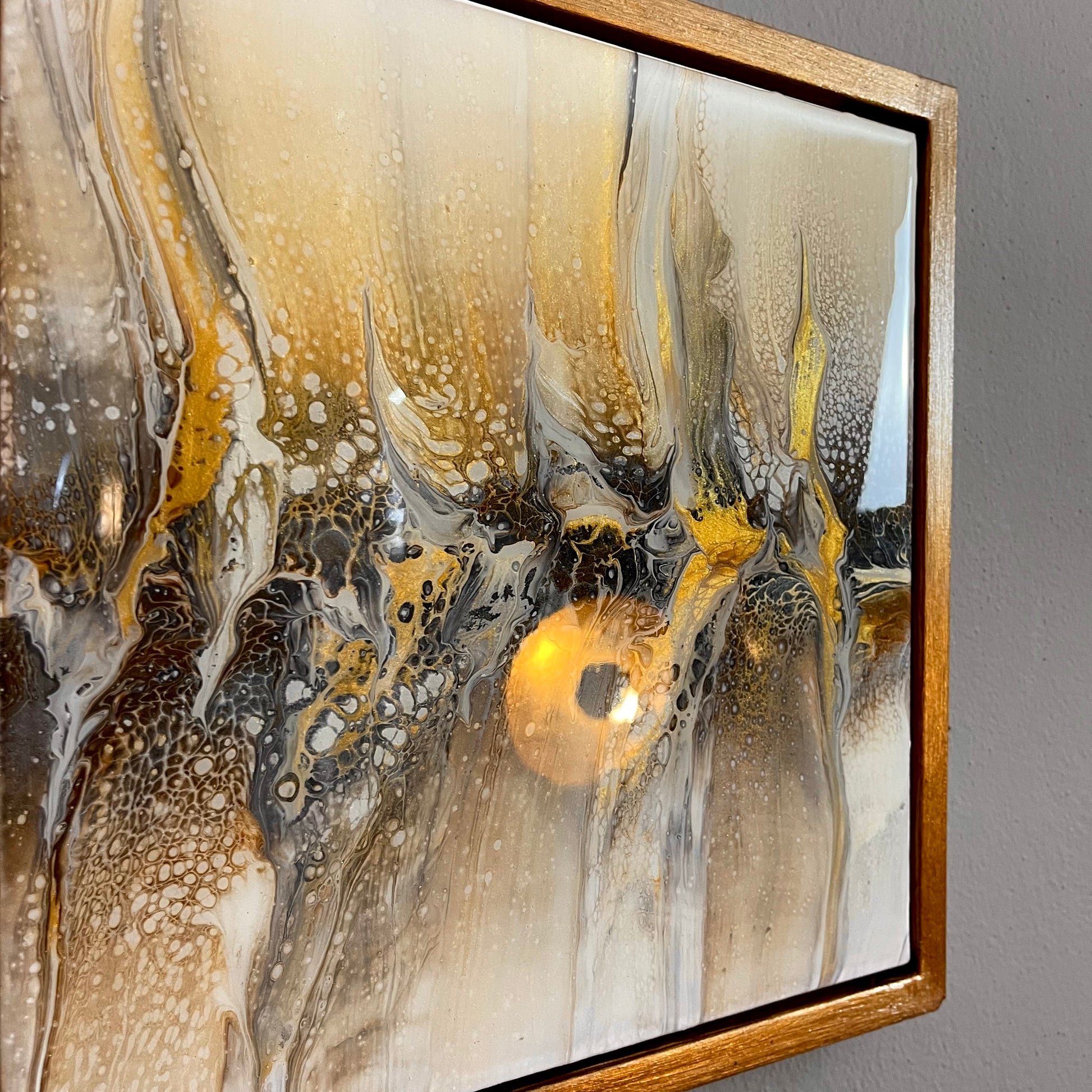 Expertly crafted with 30x30 cm dimensions, this fluid art painting on canvas is a delicate masterpiece. Featuring intricate details and an organic texture, the metallic and earthy tones on a white background exude elegance. A high-end glass-like resin finish and custom painted frame add a luxurious touch to this one-of-a-kind piece.